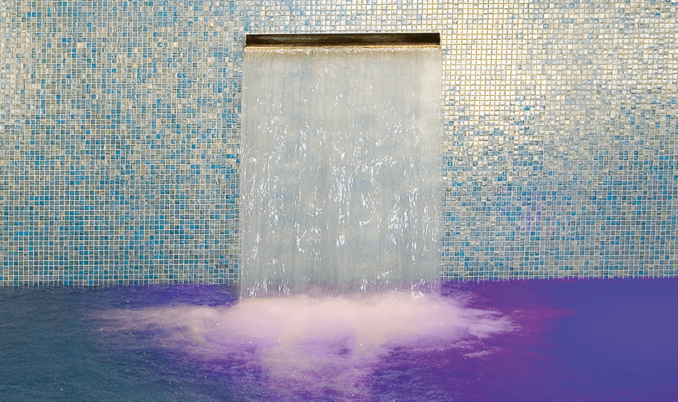 Kraftvoll rauscht das Wasser in die Tiefe. Die imposante Wirkung des Ospa-Wasserfalls auf Badegäste lässt sich mit einer stimmungsvollen Beleuchtung weiter steigern und wird so zur exklusiven Wasserattraktion.
